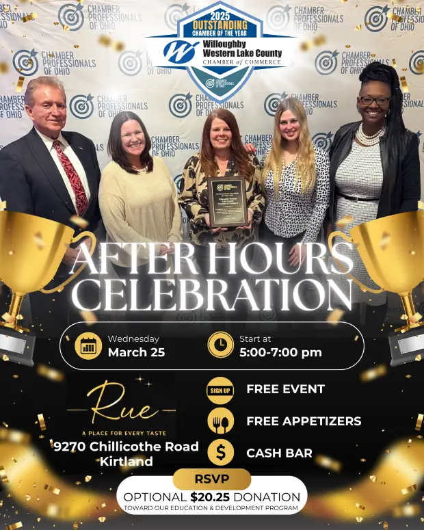 Join the WWLCC on Wednesday, March 25 from 5:00-7:00 pm at Rue (formerly Sausalito Kirtland), located at 9270 Chillicothe Road in Kirtland, for a night to celebrate our 2025 Outstanding Chamber of the Year honor!